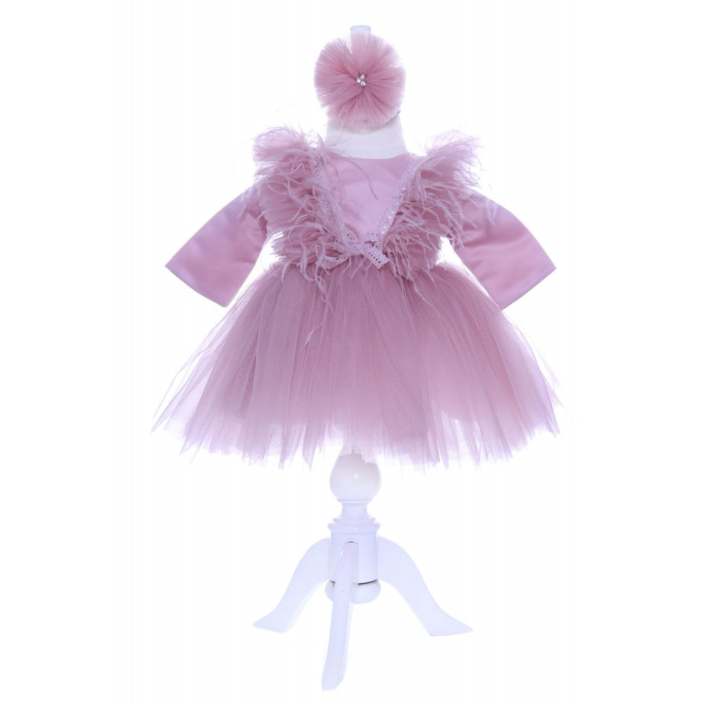 Rochie roz pudrat cu pene pentru botez, 2 piese, rochie si bentita, Recostore, REC1689