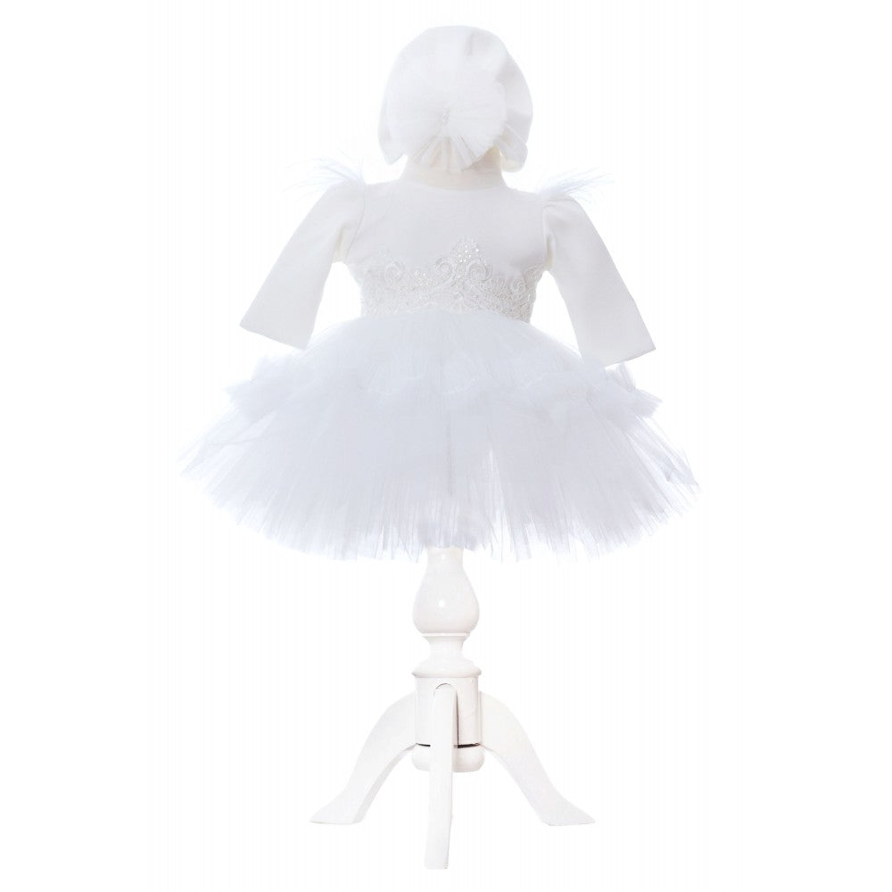 Rochia pentru fetite este eleganta si rafinata potrivita pentru orice eveniment important din primul an de viata al fetitei dumneavoastra. Este confectionata din material satinat accesorizat cu�broderie si paiete. Fusta este realizata din tulle incretit in partea de jos pentru a crea volanase si volum rochitei. Este o rochie diafana cu aer aristocrat si are ca sistem de inchidere fermoar la spate.Turbanul�este un accesoriu indispensabil oricarei domnisoare si este asortat cu rochia.Rochia este una de efect si poate fi purtata la orice ocazie speciala cum ar fi botez sau eveniment important.Rochita este realizata in Romania.