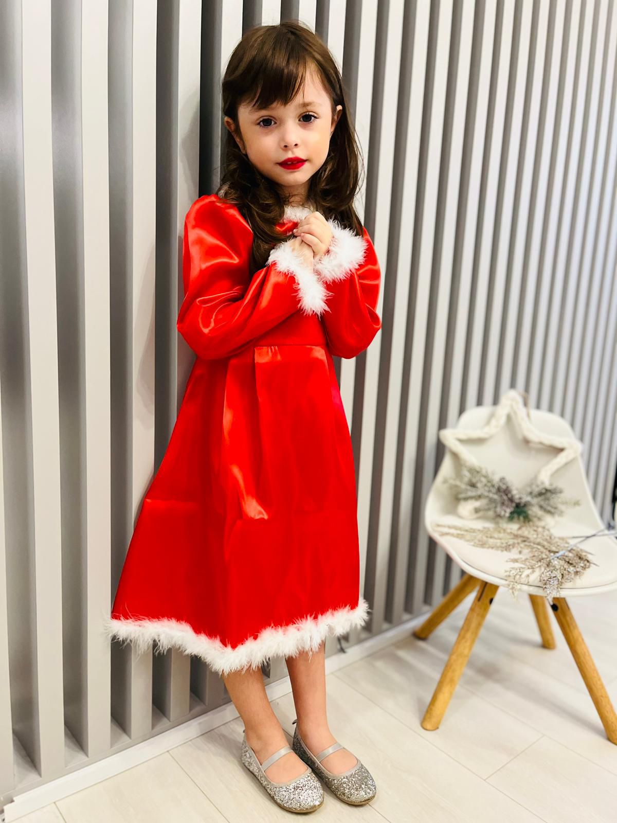 Transforma micuta ta intr-o Craciunita adorabila cu aceasta rochita rosie festiva, decorata cu blanita alba pufoasa. Perfecta pentru petreceri de sarbatori, serbari sau sesiuni foto, aceasta tinuta combina eleganta cu un aer vesel si jucaus, specific Craciunului.