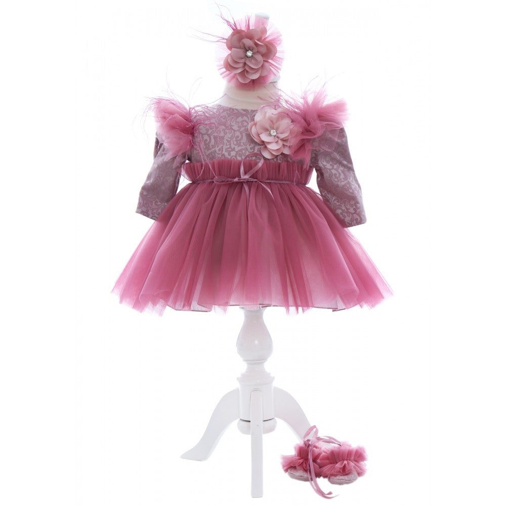 Rochita cu pantofiori si bentita roz pudrat inchis pentru botez de fetite, 3 piese, REC2441