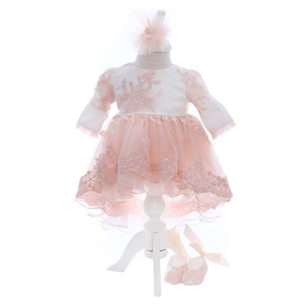 In lumea modei pentru copii, eleganta si rafinamentul se intalnesc intr-o creatie de neuitat - rochita cu trena din dantela, botosei asortati si bentita. Aceasta rochita este o capodopera a designului, potrivita pentru momentele speciale din viata micutei tale printese.