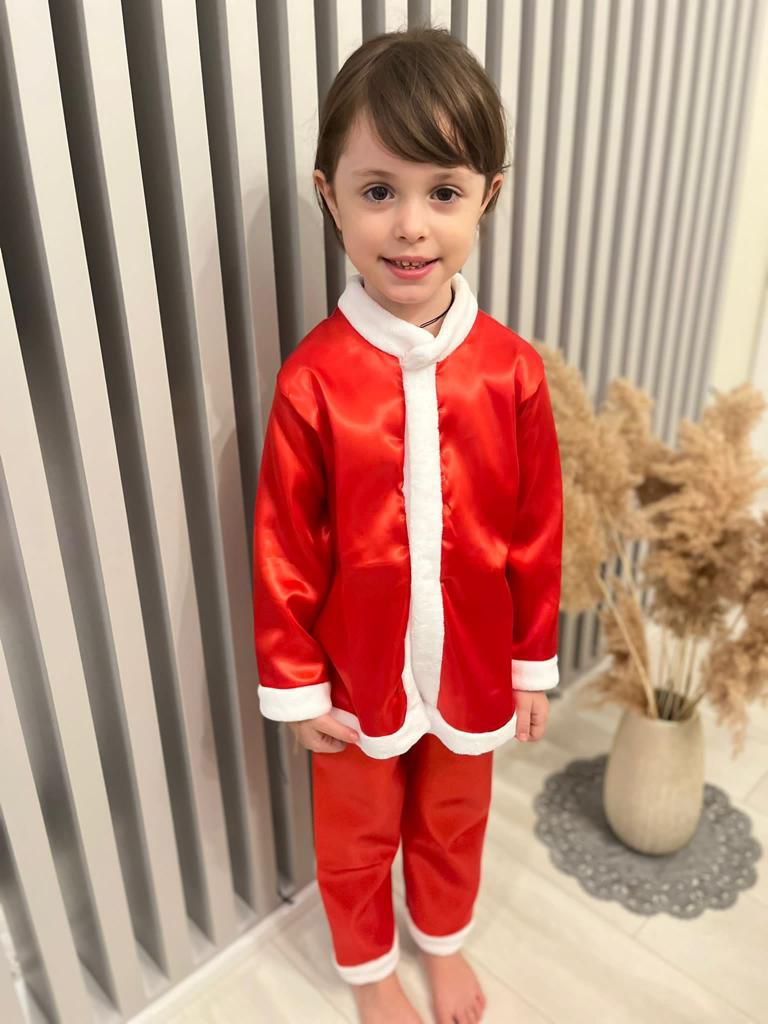 Acest costum Mos Craciun pentru copii, format din bluza si pantaloni, este alegerea perfecta pentru a transforma orice ocazie intr-o sarbatoare magica!