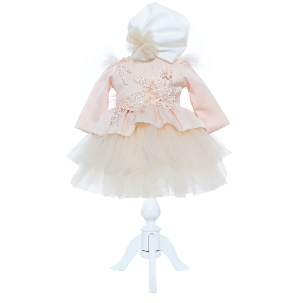Rochia pentru fetite este eleganta si rafinata potrivita pentru orice eveniment important din primul an de viata al fetitei dumneavoastra. Rochia este�confectionata din material satinat accesorizat cu pene in talie. Este�o rochie diafana cu aer aristocrat si are ca sistem de inchidere fermoar la spate.Turbanul/bentita este un accesoriu indispensabil oricarei domnisoare si este asortat cu rochia.Rochia este una de efect si poate fi purtata la orice ocazie speciala cum ar fi botez sau eveniment important.Rochita este realizata in Romania.