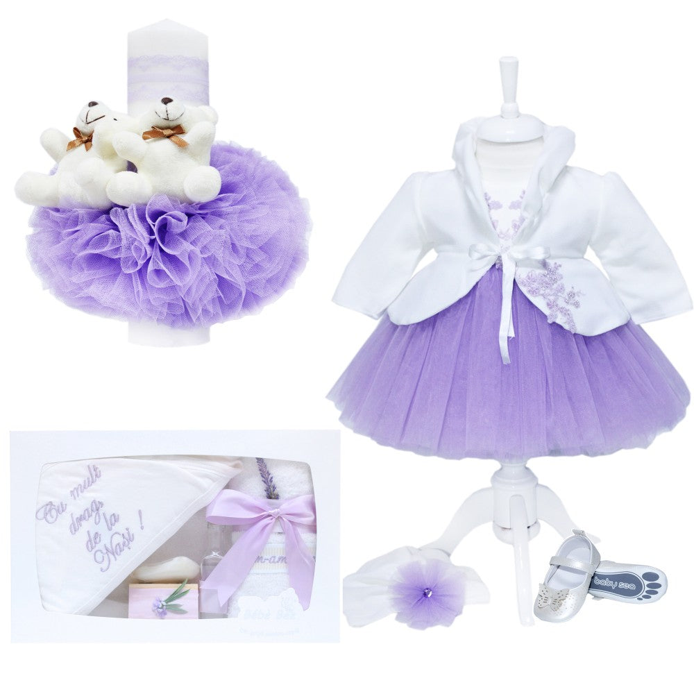 Rochie alb-lila, voluminoasa cu broderie si pliuri din tulle. Este confectionata din material satinat, tulle si broderie. Este o rochie diafana cu aer aristocrat si are ca sistem de inchidere fermoar la spate.Bolerul de culoare alba se leaga in partea din fata cu un snur delicat. Este detasabil si poate fi purtat si la o alta tinuta.Turbanul este un accesoriu indispensabil oricarei domnisoare si este asortat cu rochia.Pantalonasii stil gogosar sunt conceputi pentru a sustine scutecul si pentru a proteja bebelusul in zilele friguroase.Rochia este una de efect si poate fi purtata la orice ocazie speciala cum ar fi botez sau eveniment important.Setul este realizat in Romania de catre cei mai iscusiti croitori.