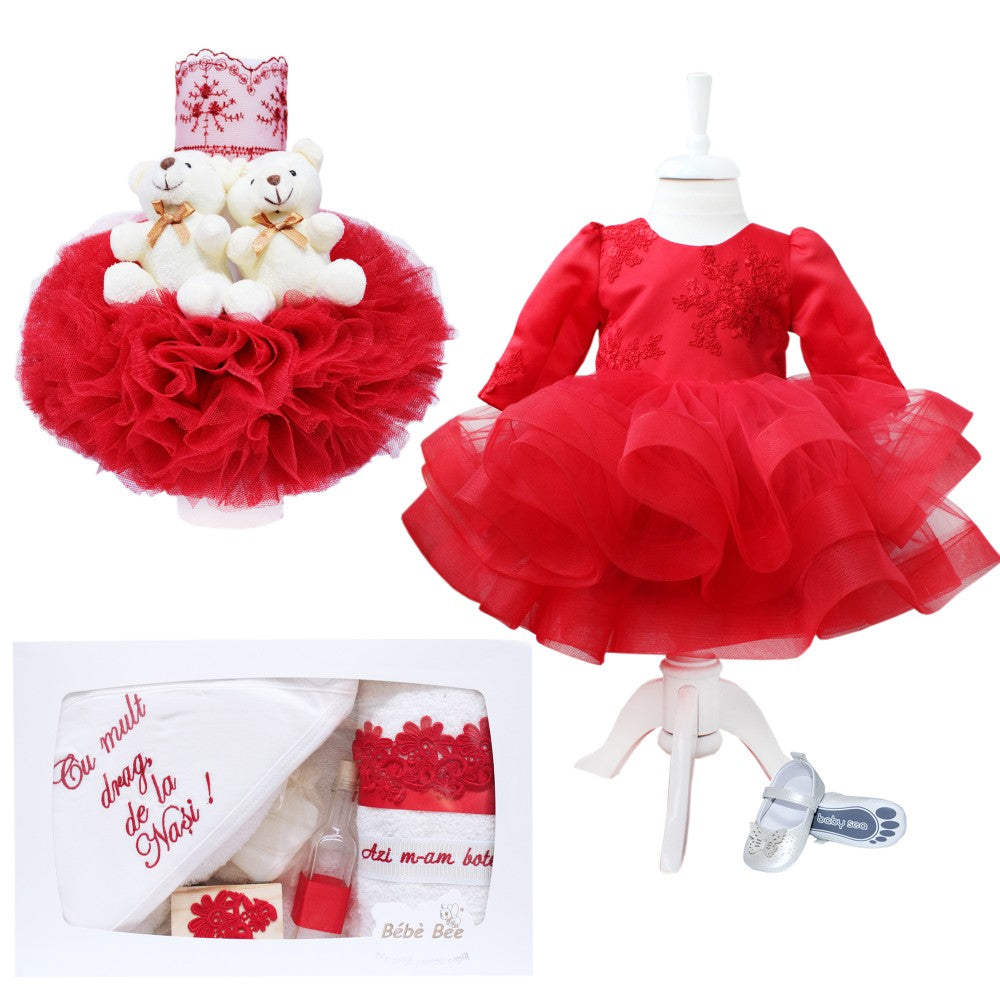 Rochia pentru fetite este eleganta si rafinata potrivita pentru orice eveniment important din primul an de viata al fetitei dumneavoastra. Este confectionata din material satinat accesorizat cu aplicatii florale decorative. Fusta este realizata din tulle incretit in partea de jos pentru a crea volanase si volum rochitei. Sistem de inchidere clasic, cu fermuar la spate.Bentita se asorteaza perfect cu intreaga tinuta si acorda un aer chic outfit-ului.Produsul este realizat in Romania din materiale de calitate.