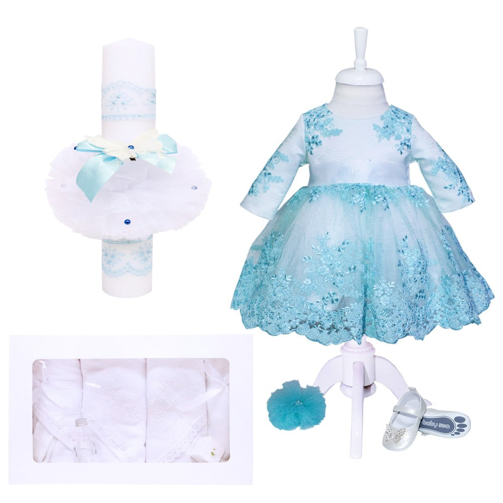 Lumanarea pentru botez este confectionata din ceara alba si este accesorizata cu tulle alb, incretit, dantela bleu si fluturi. Dimensiunile aproximative sunt: 40 cm lungime si diamentrul de 6 cm.