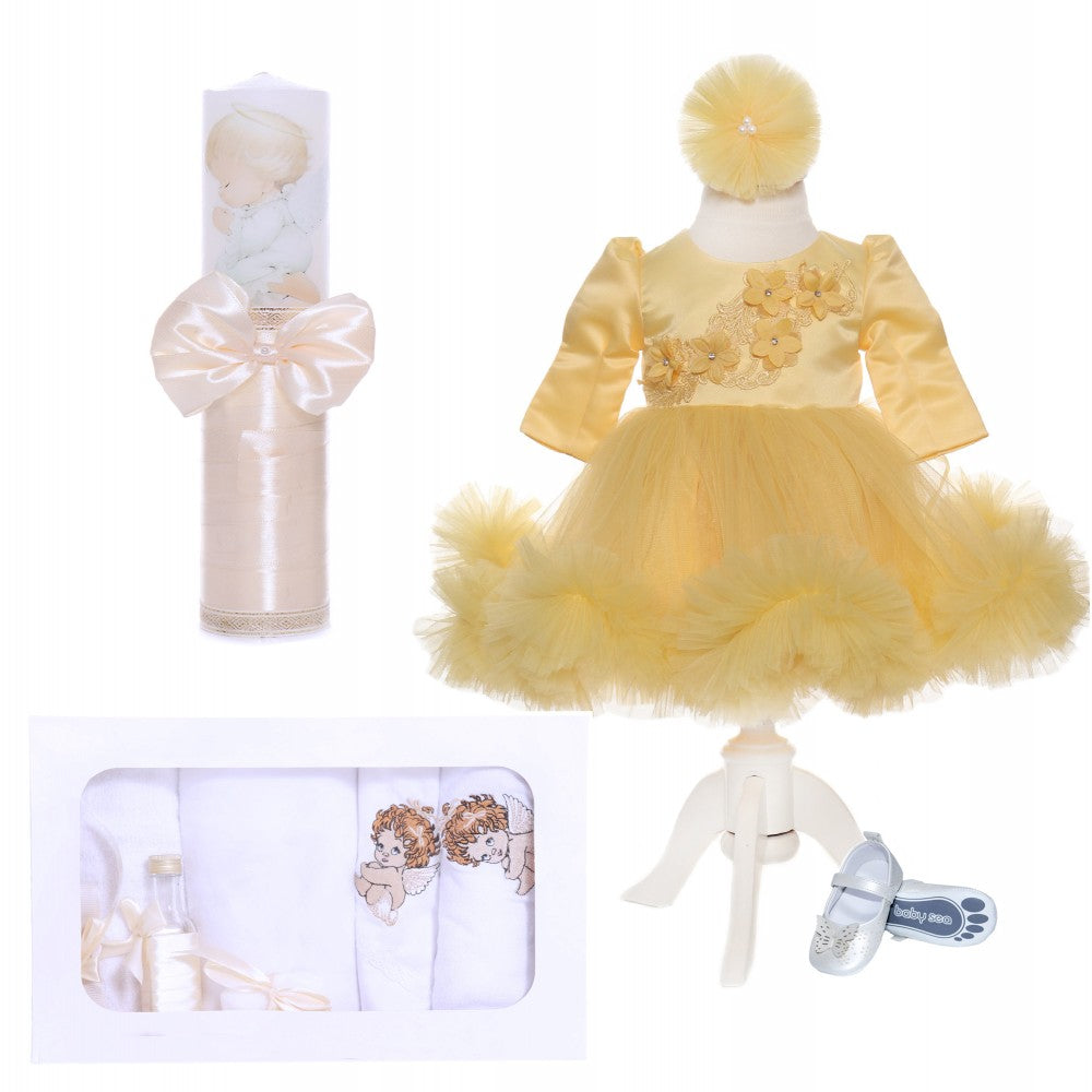 DETALII TRUSOUIn ziua ceremoniei religioase de botez, nasii sunt cei responsabili cu pregatirea necesarelor pentru crestinare.Printre acestea, trusoul include toate elementele care vor fi folosite pe parcursul ceremoniei.Trusou de culoare alb-ivoire brodat cu ingeras alcatuit din 7 piese.Trusoul include:��� �Sticluta transparenta pentru mir��� �Sapun��� �Panza mir cu ingeras brodat, dimensiune aproximativa 95 x 100 cm��� �Fasa alba dimensiune aproximativa 100 x 5cm��� �Prosop cu capison pentru bebelus brodat cu ingeras, dimensiune aproximativa 78 x 75 cm��� �Prosop alb pentru preot, dimensiune aproximativa 50 x 90 cm��� �Paturica bebe, dimensiune aproximativa 70 x 70 cmCrestinarea unui bebelus reprezinta un moment important in viata oricarei perechi de nasi.Pe langa trusou, lumanarile sunt la fel de importante in crearea unei amintiri de neuitat alaturi de nasi si parinti. Ele simbolizeaza lumina insuflata de parintii spirituali pe care bebelusul o primeste in suflet in timpul ceremoniei de botez.