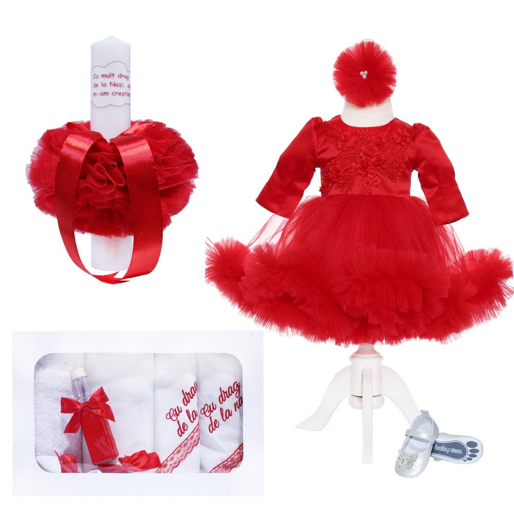 DETALII LUMANARELumanarea pentru botez este confectionata din ceara alba si este accesorizata cu tulle rosu, incretit, funda mare rosie si norisor imprimat cu mesaj �Cu mult drag de la Nasi, azi m-am crestinat�. Dimensiunile aproximative sunt: 30 cm lungime si diamentrul de 5 cm.