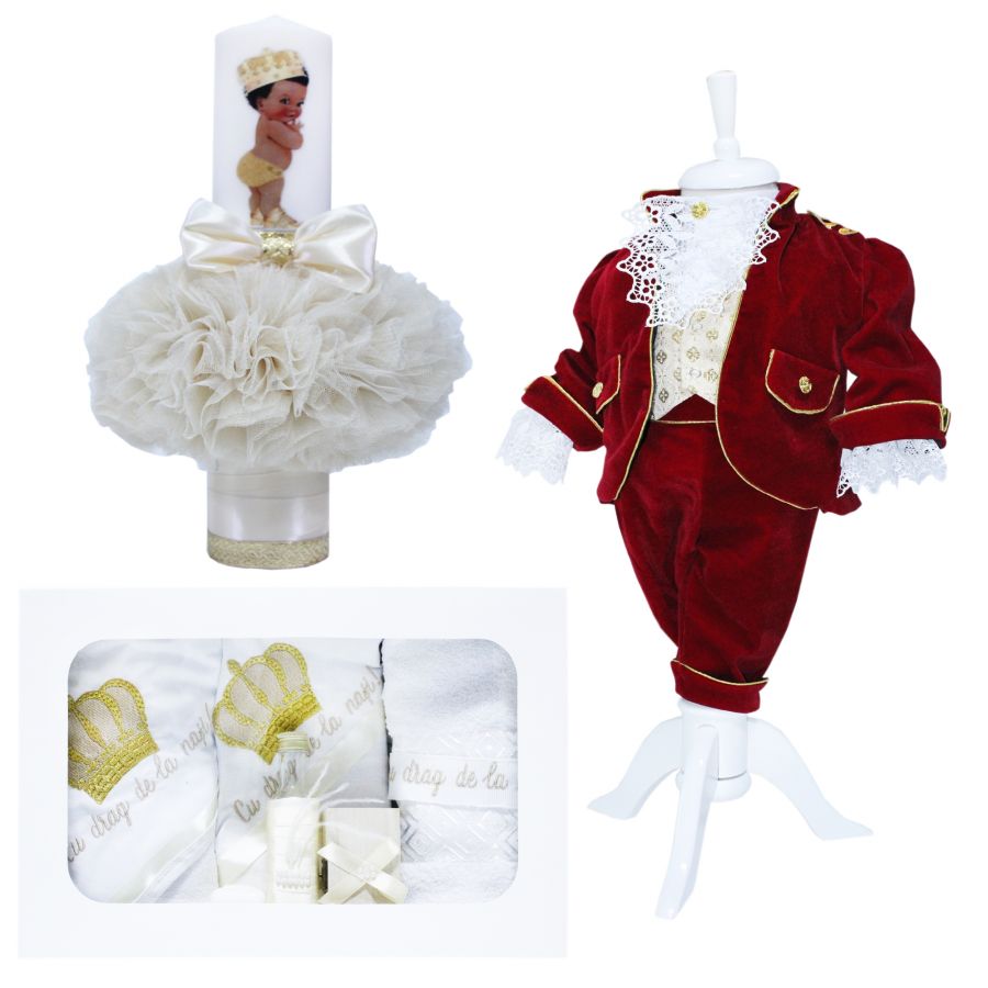 Costum Micul Print, de culoare visiniu, alcatuit din 5 piese: camasa, sacou, pantaloni, palarie si botosi.Camasa alba cu detalii din dantela si vesta aplicata este foarte eleganta si este confectionata din bumbac si poliester. Se incheie cu capse si poate fi purtata la oricare alta tinuta, pentru ca este versatila.Sacoul visiniu, din catifea, cu detalii aurii are rol estetic si nu este prevazut cu sistem de inchidere. Este foarte elegant si este potrivit pentru evenimente speciale.Pantalonii visinii sunt confectionti din acelasi material din care a fost realizat sacoul. Se muleaza perfect pe corpul oricarui baietel, deoarece sunt prevazuti cu elastic in talie.Palaria este un accesoriu elegant care completeaza tinuta. Pana si banutul auriu sunt detalii care infrumuseteaza obiectul vestimentar.Botosii se asorteaza perfect cu intregul outfit. Sunt delicati si raman fixati in piciorusul copilului cu ajutorul elasticului.Costumul poate fi purtat la orice ocazie speciala din primul an de viata al bebelusului.