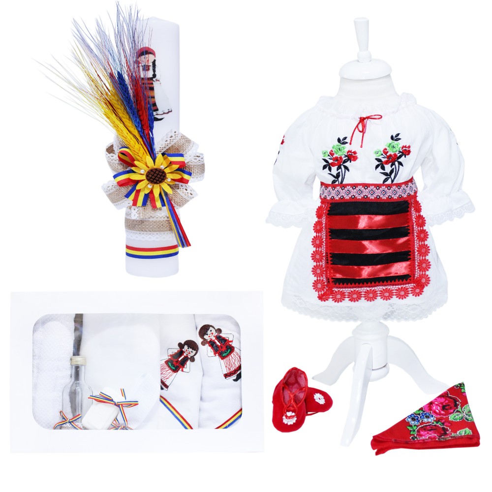 Costum popular de culoare alb-rosu alcatuit din 5 piese: bluza, fusta, fota, botosi si batic.Bluza alba realizata din bumbac 100% este versatila si poate fi purtata si in combinatie���������� cu alte haine. Manecile si gulerul sunt accesorizate cu broderie de calitate, iar modelul�� traditional adauga o pata de culoare.Fusta alba este simpla si este confectionata din bumbac 100%.Fota rosie adauga un aer cochet intregii tinute. Aceasta se muleaza perfect pe talia oricarei fetite deoarece este prevazuta cu elastic in talie.Botosii rosii sunt realizati din catifea si sunt un accesoriu indispensabil oricarei domnisoare.Baticul rosu cu motive florale se asorteaza perfect cu tinuta si armonizeaza intregul costum popular. De asemenea adauga un aer rustic outfit-ului.Costumul popular poate fi purtat la orice ocazie speciala cum ar fi botez, Zi Nationala, Invierea Domnului sau la orice alt eveniment�