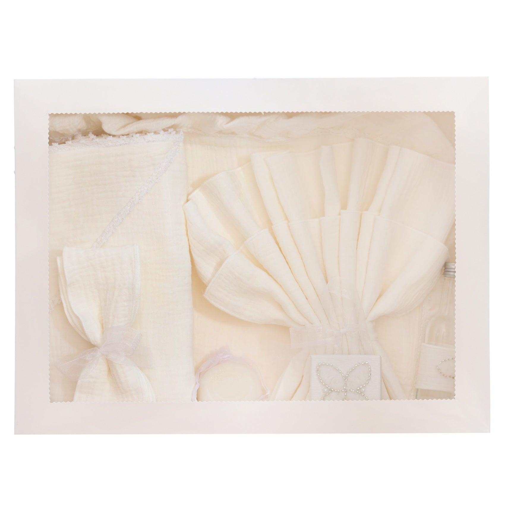 Trusou din muselina, culoare ivoire, este alcatuit din 7 piese.