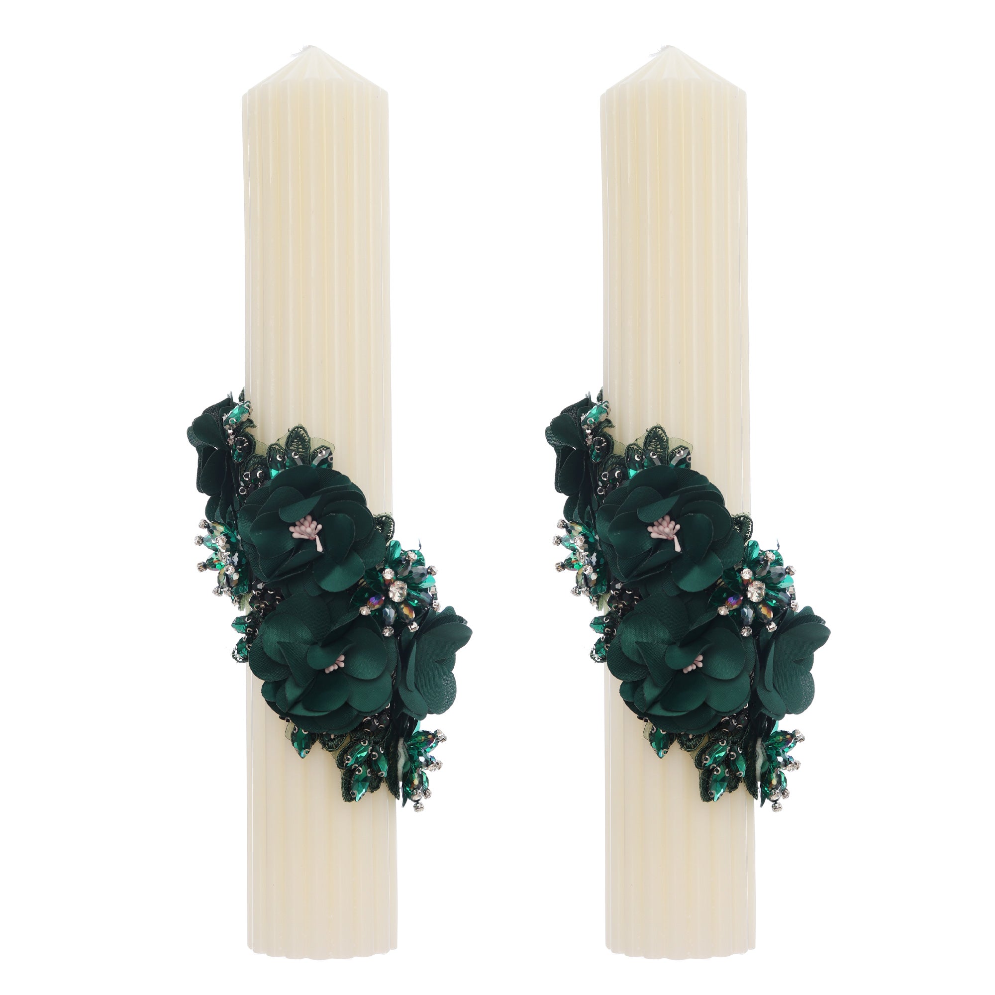 Fiecare lumânare este accesorizată cu accesoriu floral decorativ, realizat cu pietricele strălucitoare, ce oferă o notă subtilă de lux și romantism. Accesoriul floral este montat cu grijă, astfel încât să se îmbine armonios cu textura canelată a lumânării.