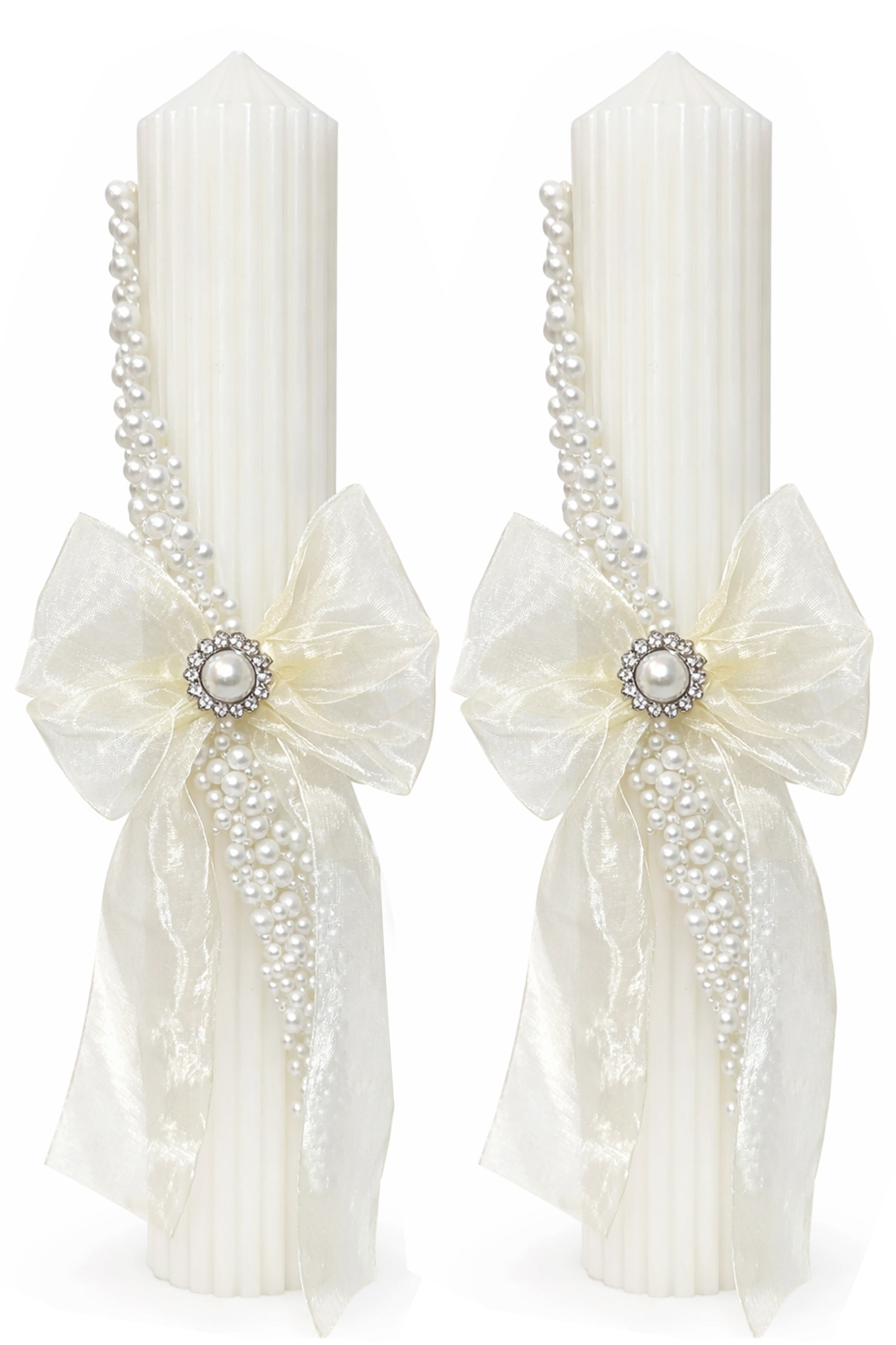 Fiecare lumânare este accesorizată cu funda si perle, ce oferă o notă subtilă de lux și romantism. Accesoriul este montat cu grijă, astfel încât să se îmbine armonios cu textura canelată a lumânării.