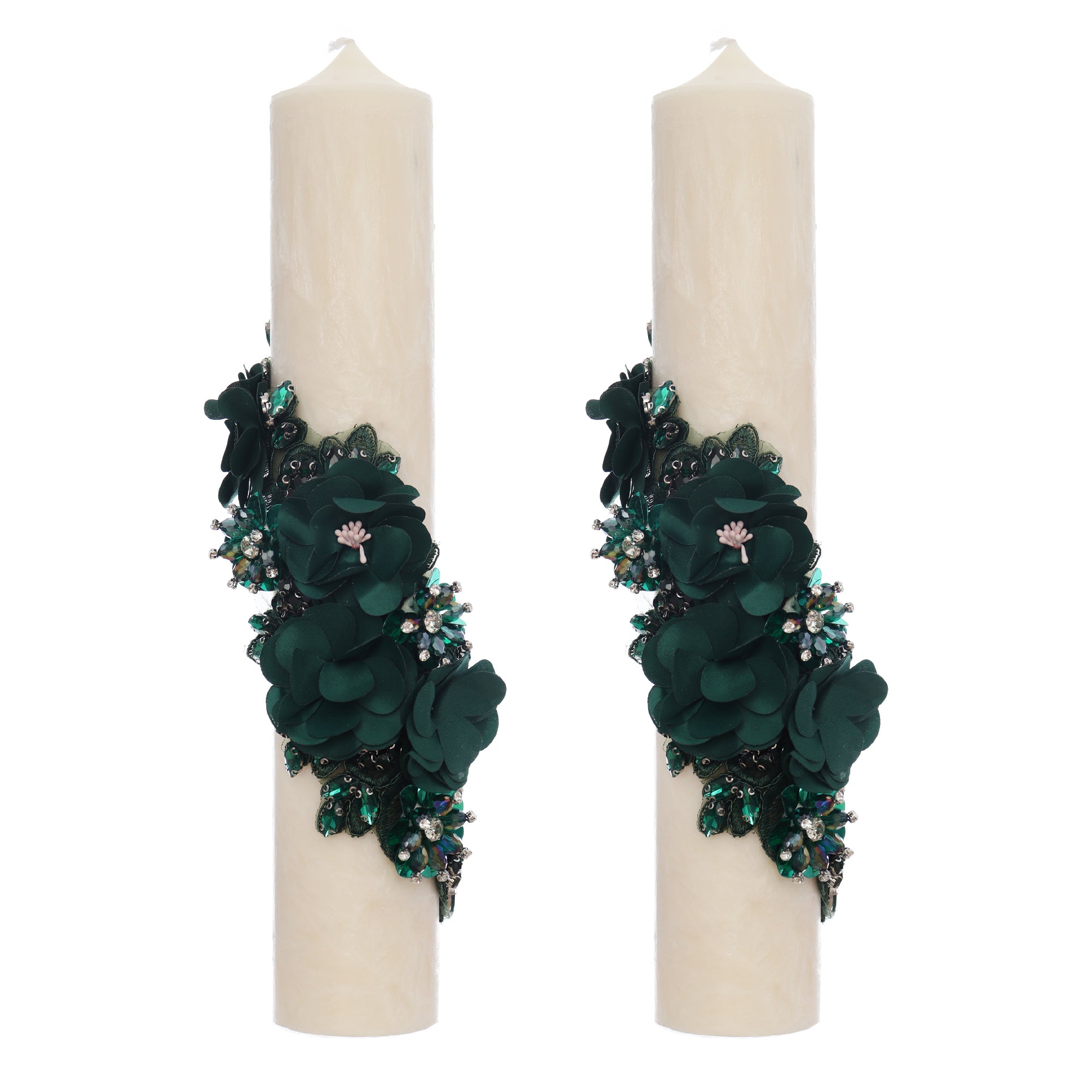 Fiecare lumânare este accesorizată cu accesoriu floral decorativ, realizat cu pietricele strălucitoare, ce oferă o notă subtilă de lux și romantism. Accesoriul floral este montat cu grijă, astfel încât să se îmbine armonios cu textura canelată a lumânării.