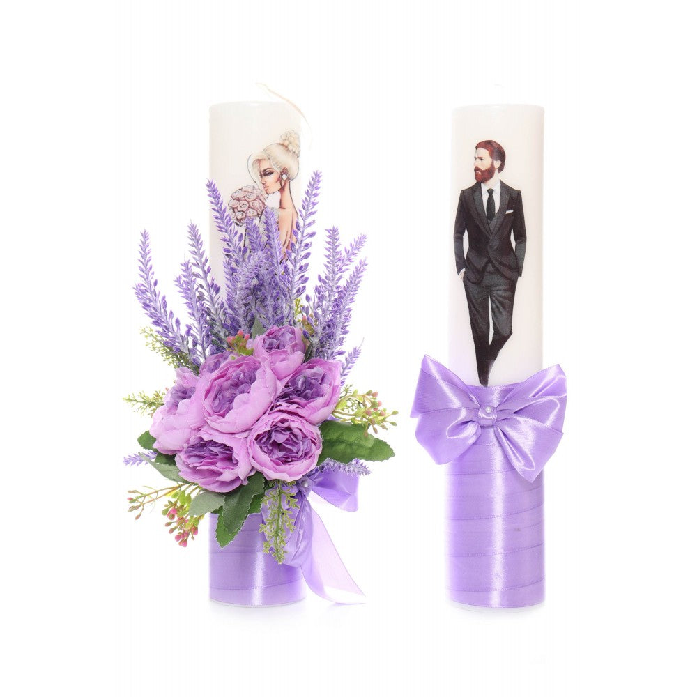 Set doua lumanari pentru nunta, mire si mireasa. Cu un design modern, acestea sunt perfecte pentru o nunta ca in povesti.Lumanarea miresei este realizata cu panglica lila si este accesorizata cu flori artificiale. Lumanarea mirelui este realizata cu panglica lila si este accesorizata cu papion asortat.Dimensiunile lumanarilor sunt: