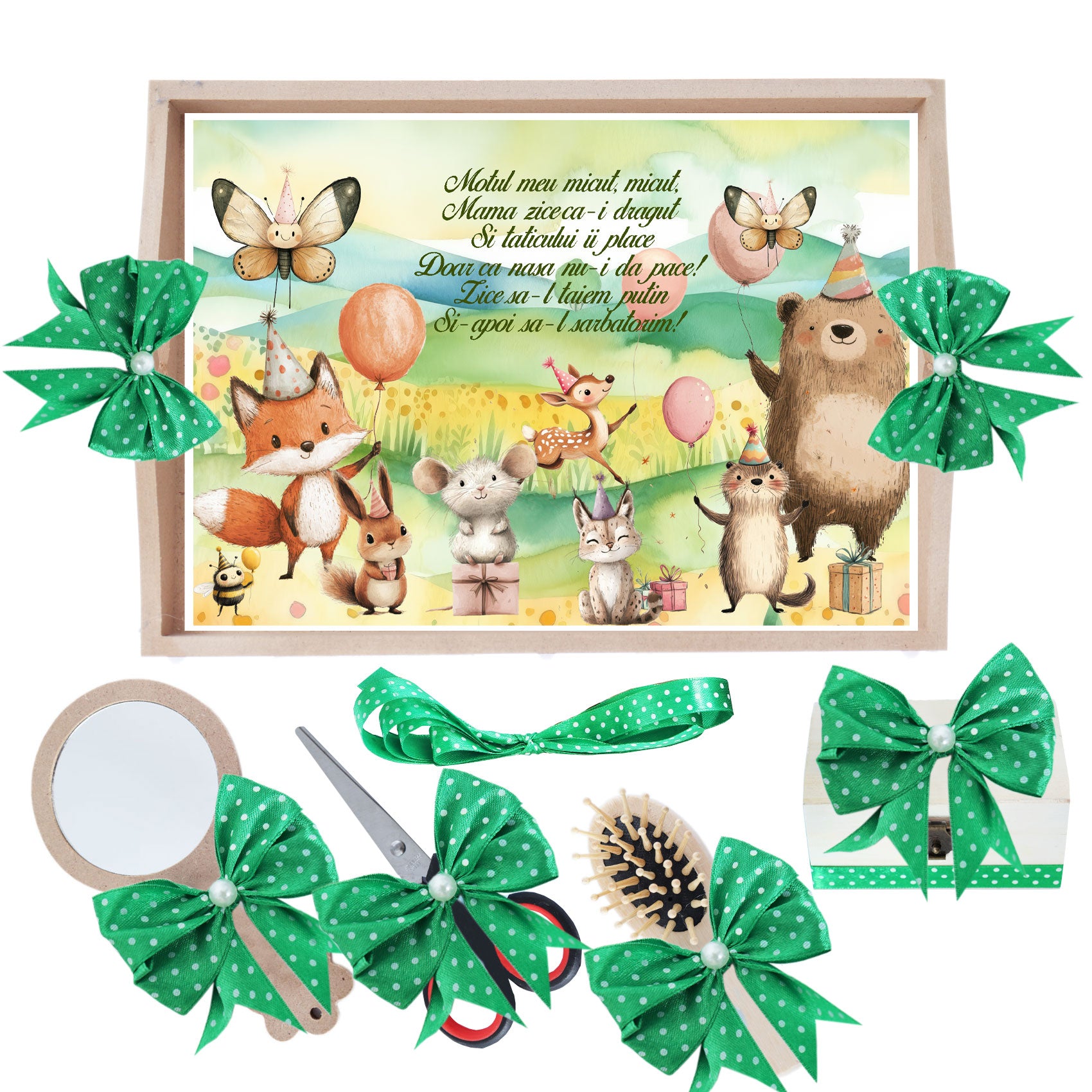 Continut:Cutiuta suvita|Foarfeca|Fundita|Oglinda|Perie|Tavita din lemn