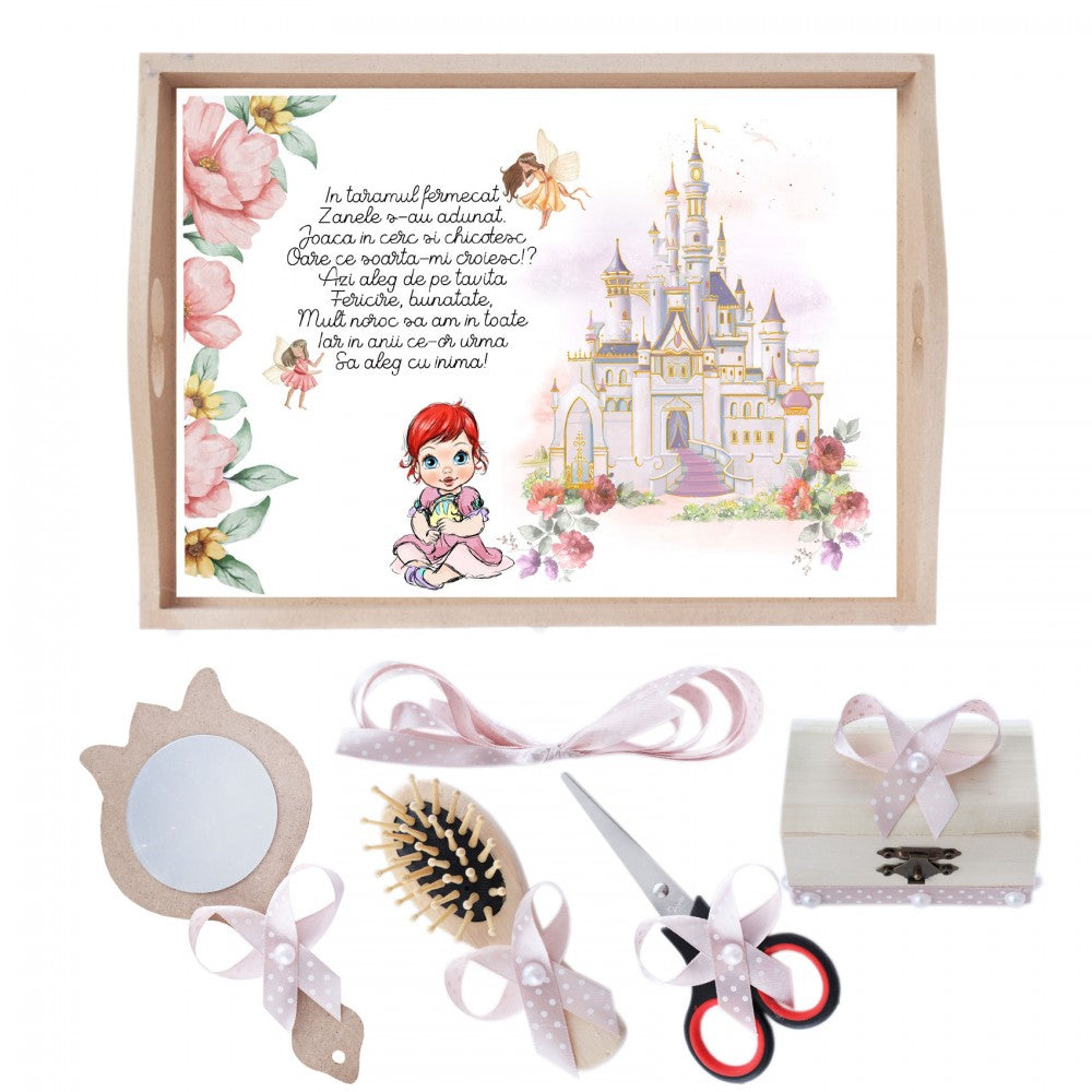 Continut:Cutiuta suvita|Foarfeca|Fundita|Oglinda|Perie|Tavita din lemn