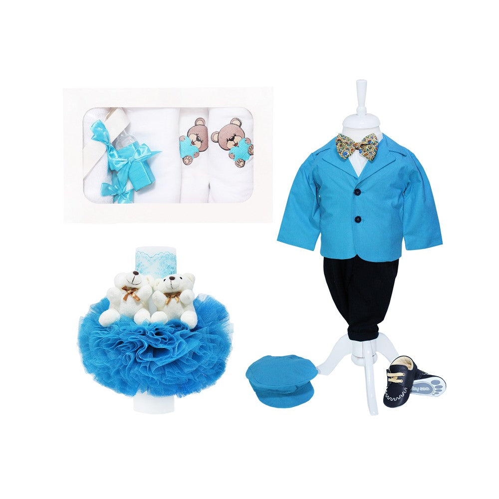 Costum elegant turcoaz-bleumarin, din bumbac mat, alcatuit din 5 piese: sacou, camasa, papion, pantaloni cu bretele atasate si bascuta.Camasa alba, simpla este confectionata din bumbac. Se incheie cu nasturi si poate fi purtata si in combinatie cu alte haine.Papionul este un accesoriu elegant si necesar care completeaza intreaga tinuta. Este atasat pe un snur elastic care poate fi reglat.Sacoul este o piesa vestimentara importanta care scoate in evidenta outfit-ul si de asemenea culoarea indrazneata scoate din anonimat orice tinuta. Acesta are sistem de inchidere cu nasturi.Pantalonii se potrivesc perfect cu sacoul. Se muleaza pe corpul oricarui baietel, deoarece sunt prevazuti cu elastic in talie, dar si cu bretele reglabile.Bascuta este un accesoriu indispensabil si intregeste tinuta conferindu-i un aer cochet si rafinat.Costumul poate fi purtat la orice ocazie speciala cum ar fi botez sau orice alt eveniment important.Pentru varsta de 1-4 luni costumasul se potriveste bebelusilor cu inaltimea de 60-65 cm, iar pentru varsta de 4-8 luni se potriveste pentru o inaltime de 66-72 cm.Intregul costum este realizat in Romania din materiale de calitate (bumbac mat 100%).