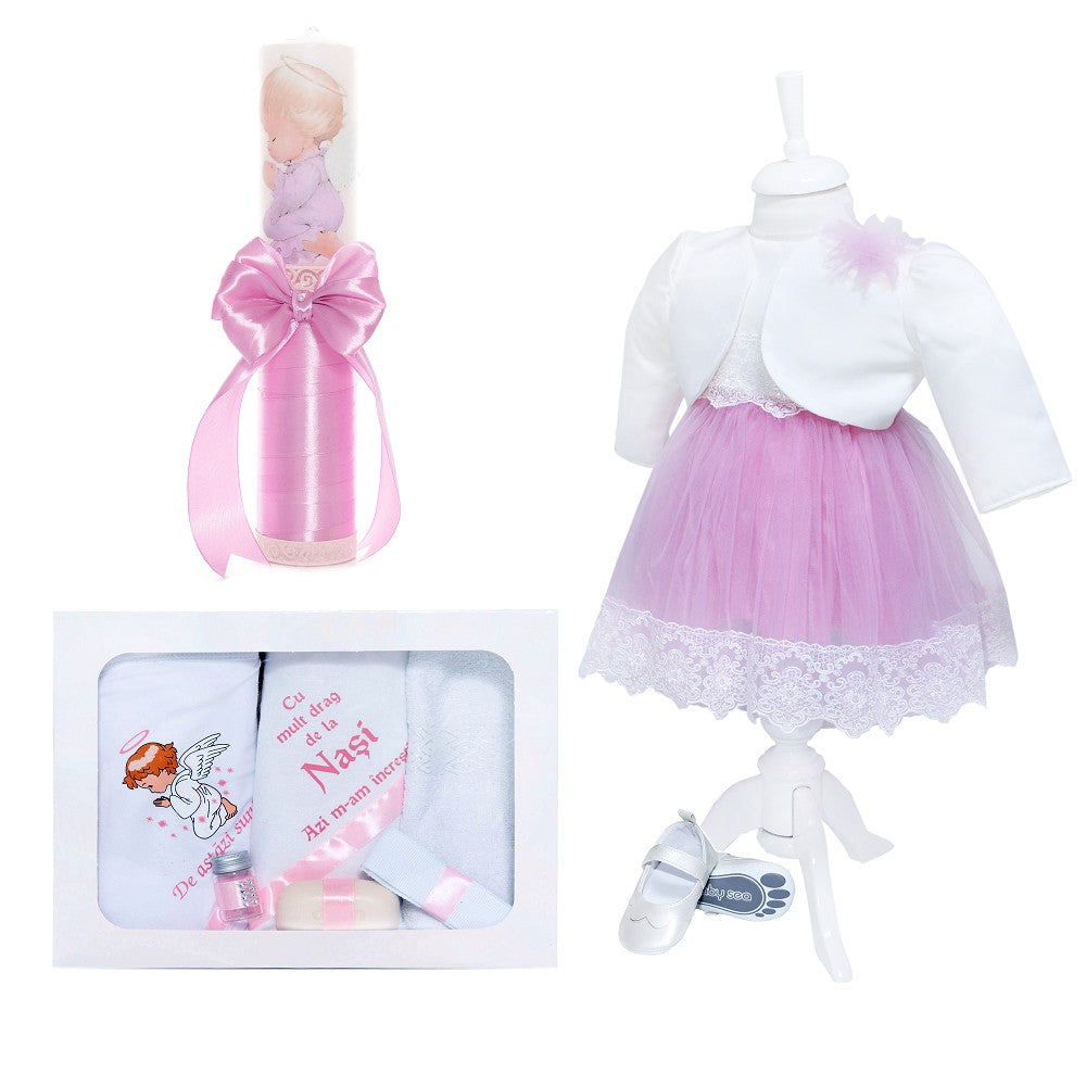In ziua ceremoniei religioase de botez, nasii sunt cei responsabili cu pregatirea necesarelor pentru crestinare.Printre acestea, trusoul include toate elementele care vor fi folosite pe parcursul ceremoniei.DETALII TRUSOUTrusou cu ingeras de culoare alb-roz cu mesaj �De azi sunt crestin� imprimat alcatuit din 6 piese.Trusoul include:- Sticluta transparenta pentru mir- Sapun- Panza mir, dimensiune aproximativa 95 x 100 cm- Fasa alba dimensiune aproximativa 100 x 5cm- Prosop cu capison pentru bebelus, dimensiune aproximativa 78 x 75 cm- Prosop alb pentru preot, dimensiune aproximativa 30 x 50 cmCrestinarea unui bebelus reprezinta un moment important in viata oricarei perechi de nasi. Pe langa trusou, lumanarile sunt la fel de importante in crearea unei amintiri de neuitat alaturi de nasi si parinti. Ele simbolizeaza lumina insuflata de parintii spirituali pe care bebelusul o primeste in suflet in timpul ceremoniei de botez.