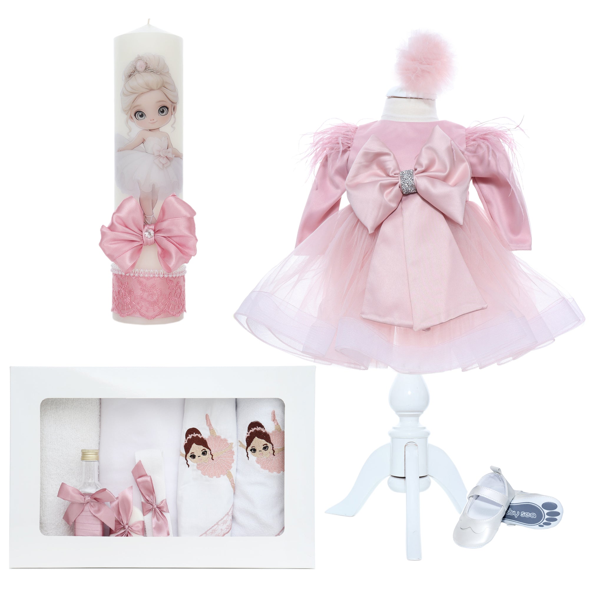 Set trusou complet pentru botez de fete, roz pudrat, model cu Balerina, 11 piese, Rochita, Lumanare cu balerina, trusou Brodat si pantofiori, REC2578
