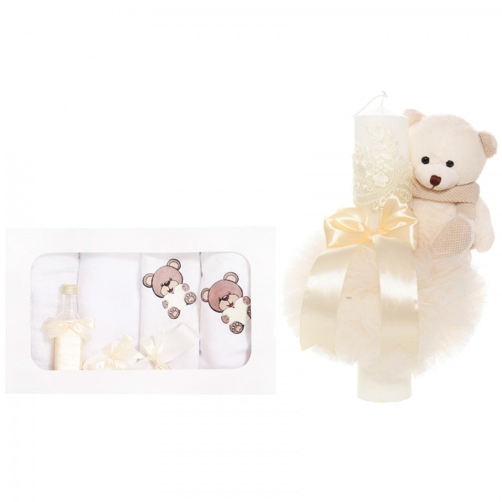 DETALII LUMANARELumanarea pentru botez este confectionata din ceara alba si este accesorizata cu tulle ivoire incretit, fundita si un ursulet de plus. Ursuletul de plus sunt detasabil si pot ramane amintire bebelusului, pentru a crea impreuna momente frumoase.Dimensiunile aproximative sunt:- Lumanare: 35 cm lungime si diamentrul de 7 cm.- Jucarie de plus: 20 cm