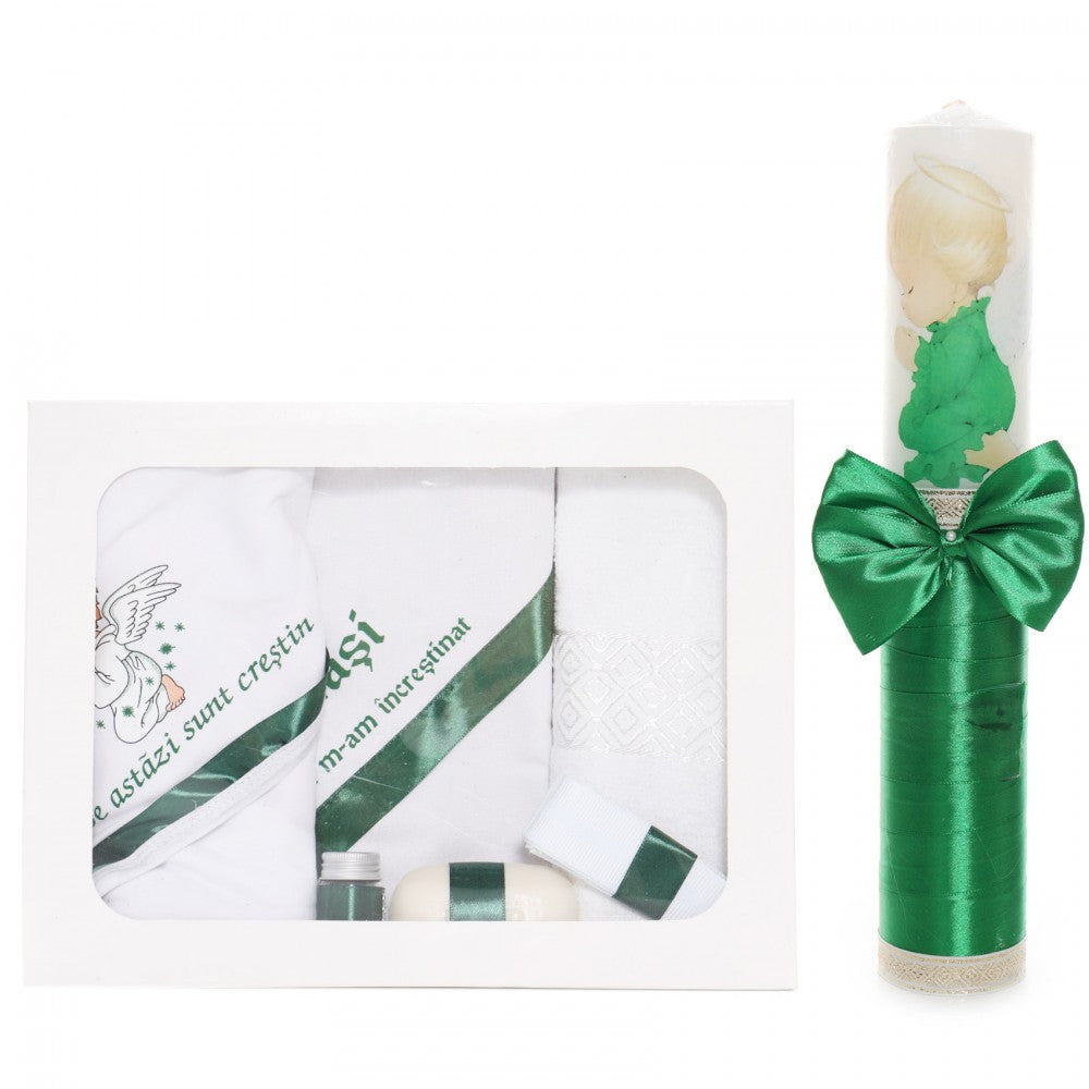 Trusou de culoare alb-verde cu ingeras imprimat si mesaj �De azi sunt crestin� alcatuit din 6 piese.