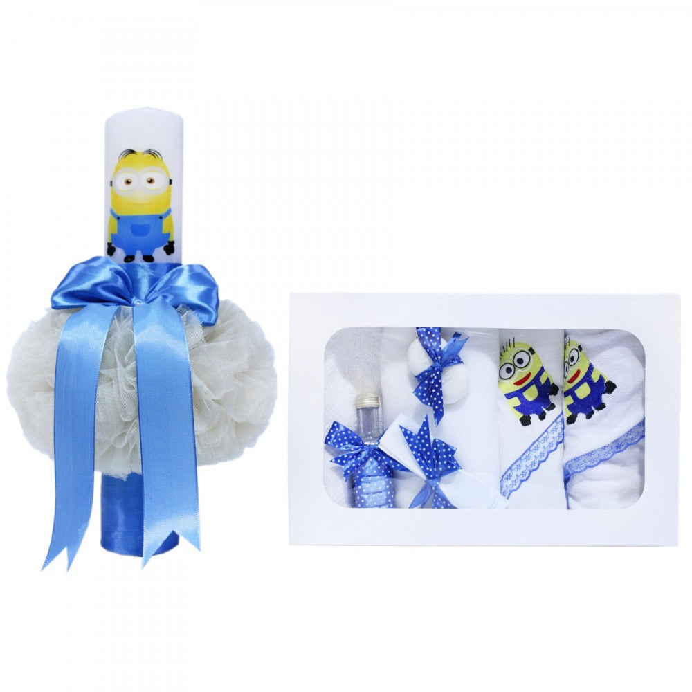 Set trusou si lumanare pentru botez de baieti, Minions, albastru, 8 piese, Recostore, REC1821