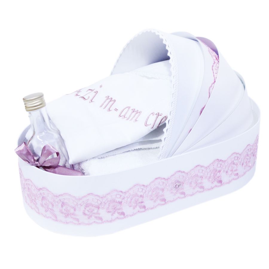 Trusou alb-roz pudrat, tip landou, �Azi m-am crestinat�, 6 piese, sticla mir, sapun, panza mir, fasa, prosop cu capison, prosop preot, REC255
