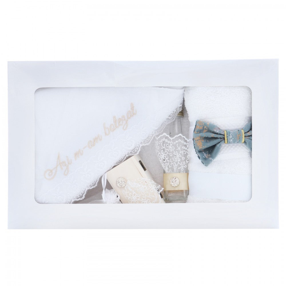 Trusou de culoare alb-bleu brodat cu "azi m-am crestinat, alcatuit din 7 piese.