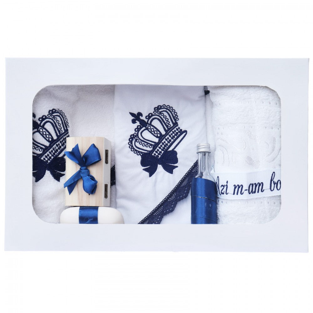Trusou de culoare alb-bleumarin cu coroana brodat, alcatuit din 7 piese.