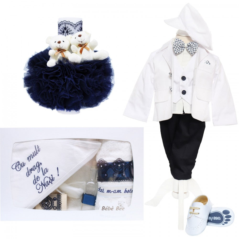 Costum alb alcatuit din 5 piese: camasa cu vesta aplicata, papion, pantaloni, sacou si bascuta.Camasa alba cu vesta aplicata este confectionata din bumbac. Se incheie cu nasturi si poate fi purtata si in combinatie cu alte haine.Papionul este un accesoriu elegant si necesar care completeaza intreaga tinuta.Sacoul din bumbac este o piesa vestimentara importanta care scoate in evidenta outfit-ul. Se inchide cu nasturi, iar buzunarele sunt doar cu rol estetic.Pantalonii se potrivesc perfect cu sacoul. Se muleaza perfect pe corpul oricarui baietel, deoarece sunt prevazuti cu elastic in talie.Bascuta este un accesoriu indispensabil si este realizata din acelasi material cu sacoul.Intregul costum este realizat in Romania.1-3 luni = 56-62 cm3-6 luni = 62-68 cm6-9 luni = 68-74 cm