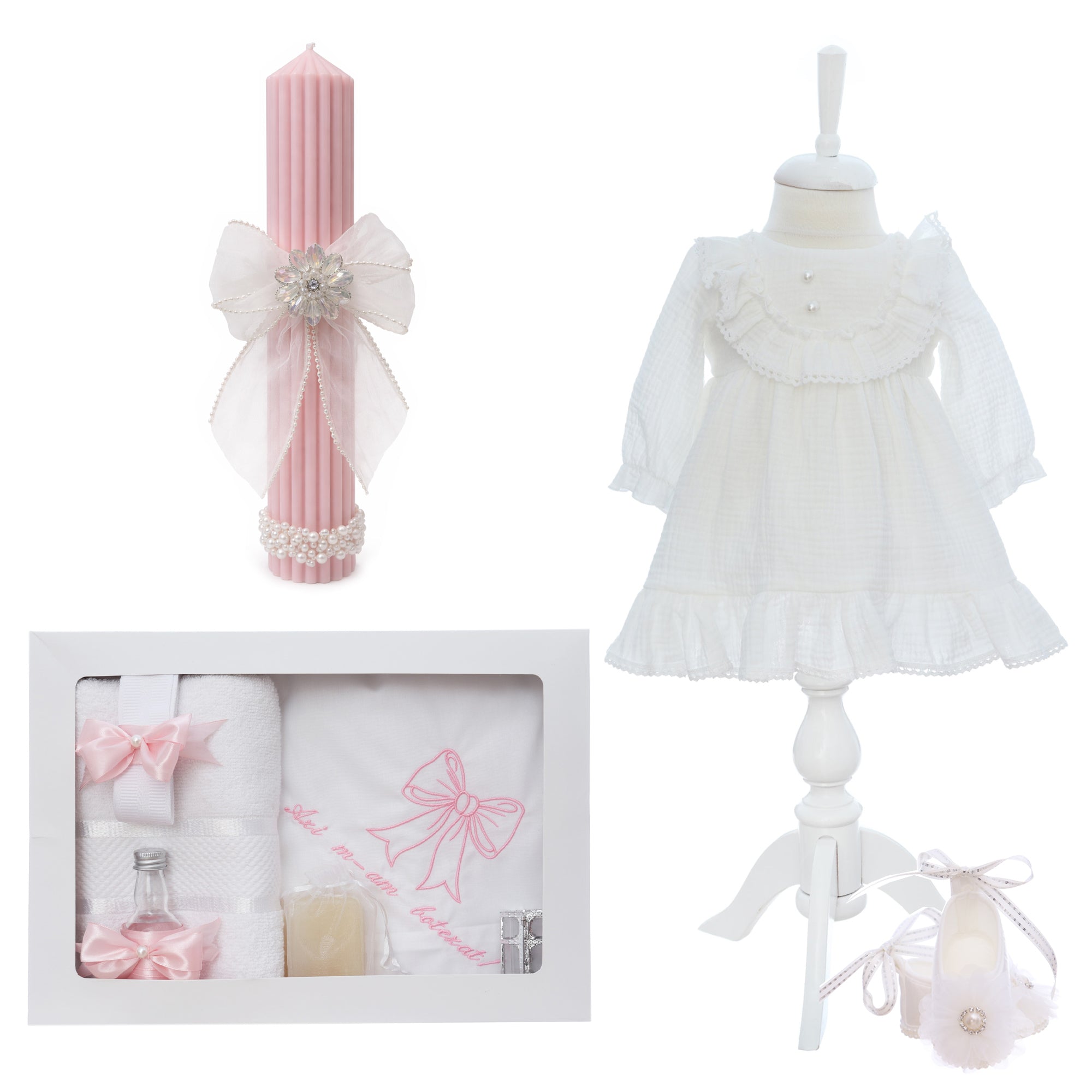 Acest trusou de botez reuneste toate piesele necesare pentru unul dintre cele mai emotionante momente din viata unui bebelus – Taina Sfantului Botez. Realizat din materiale moi si atent alese, trusoul imbina simplitatea cu simbolistica traditiei, fiind potrivit pentru orice ceremonie religioasa.