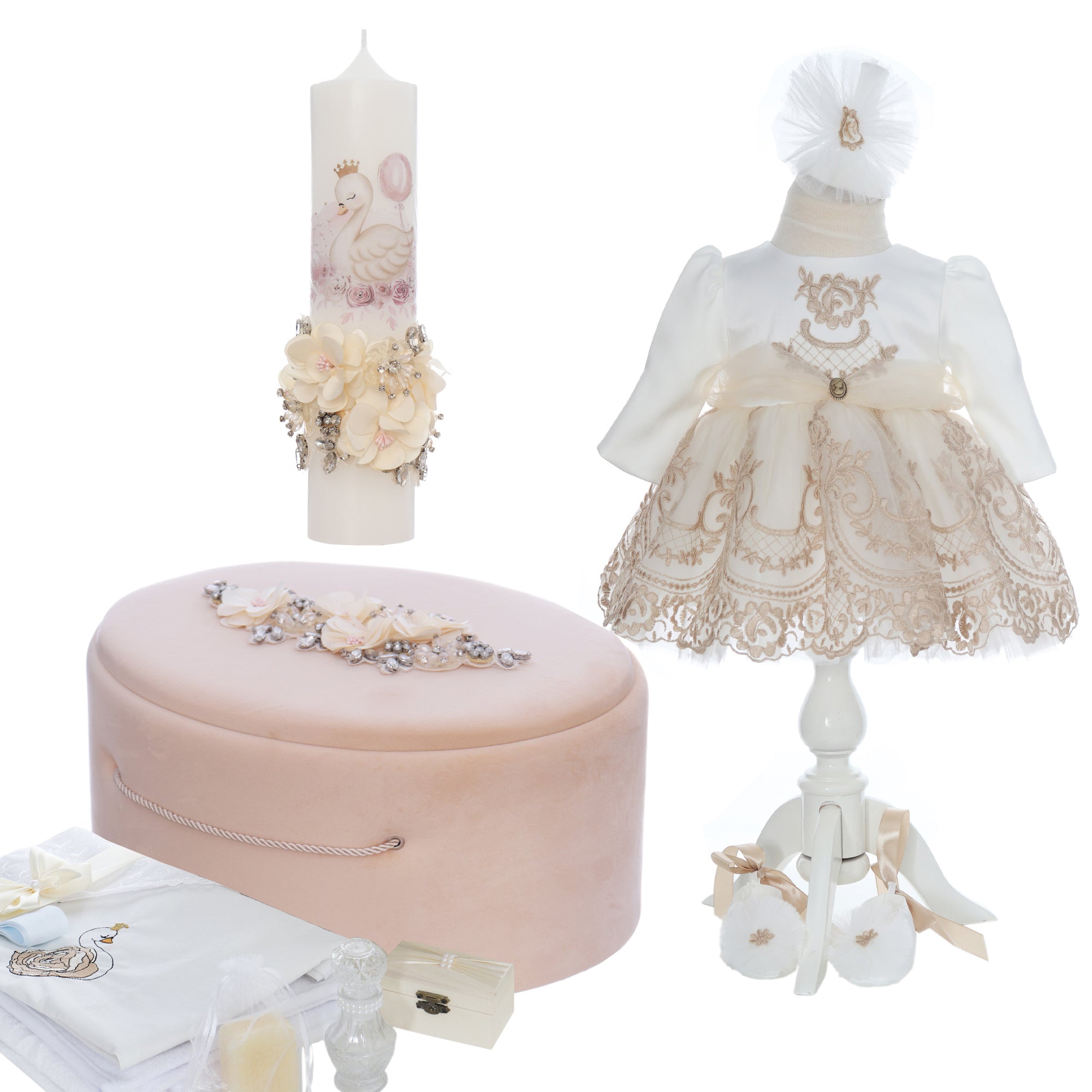 Aceasta cutie de transport pentru trusoul de botez, decorata cu acesoriu deosebit pe capac, este conceputa pentru a pastra intr-un mod elegant si sigur toate elementele esentiale ale ceremoniei. Cu un design simplu si rafinat, cutia devine o marturie a momentului special, ideala pentru pastrarea amintirilor dragi de la botez. Trusoul include prosop, panza de mir, fasa, sticluta pentru mir, sapun, pled din muselina, cutiuta prima suvita, prosop preot si fasa, toate aranjate elegant. Cutia este conceputa pentru a fi atat practica, cat si estetica, oferind un mod organizat si sigur de a transporta fiecare obiect necesar pentru ritualul de botez. Aceasta cutie devine un set complet, ideal pentru o ceremonie de neuitat.