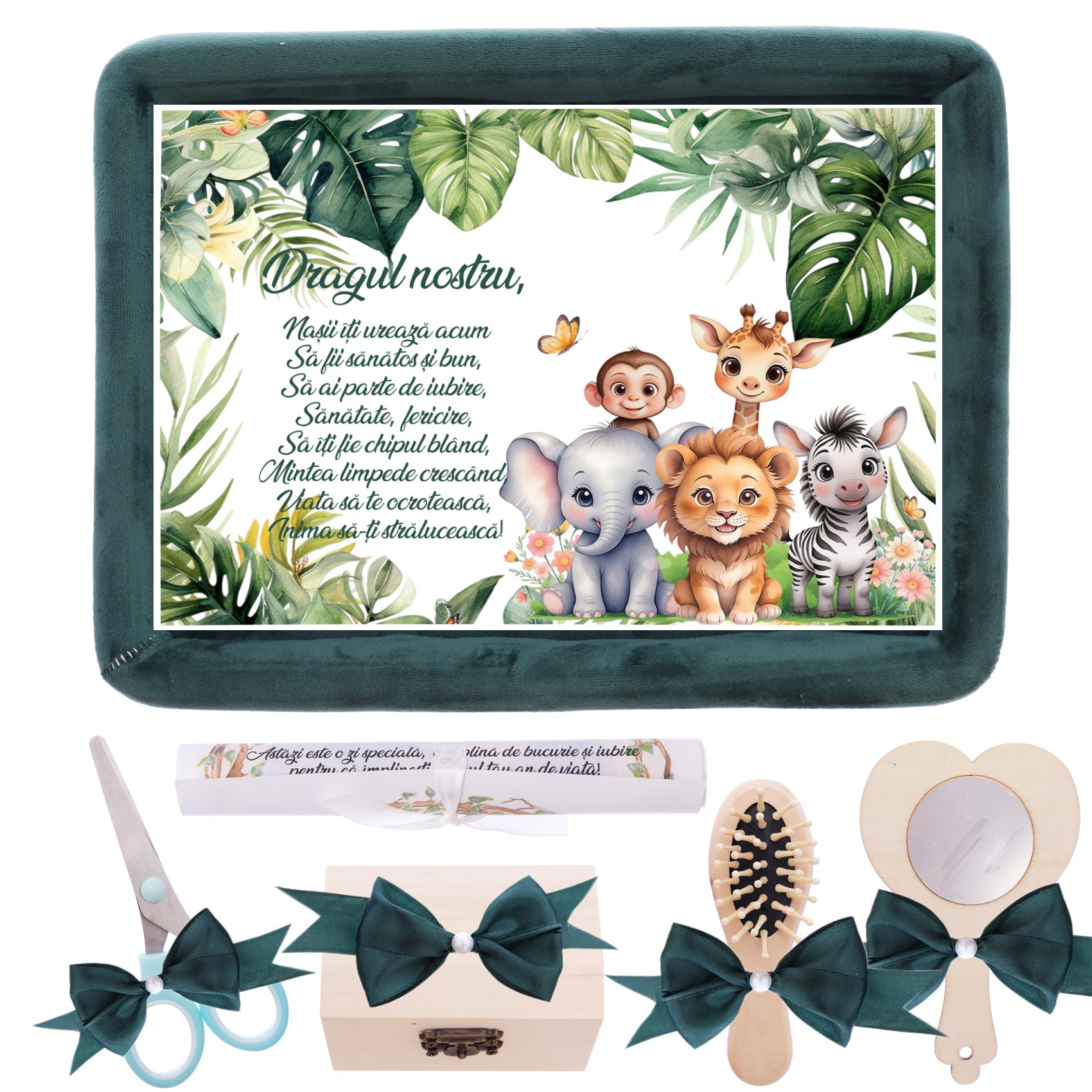 Trusou mot baieti, aniversare 1 an, Jungla, catifea verde inchis, 7 piese, 34x25 cm, REC5011/33
