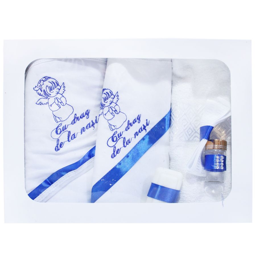 Trusou pentru botez, alb-albastru, cu ingeras brodat, 6 piese, sticla mir, sapun, panza mir, fasa, prosop cu capison, prosop preot, REC281