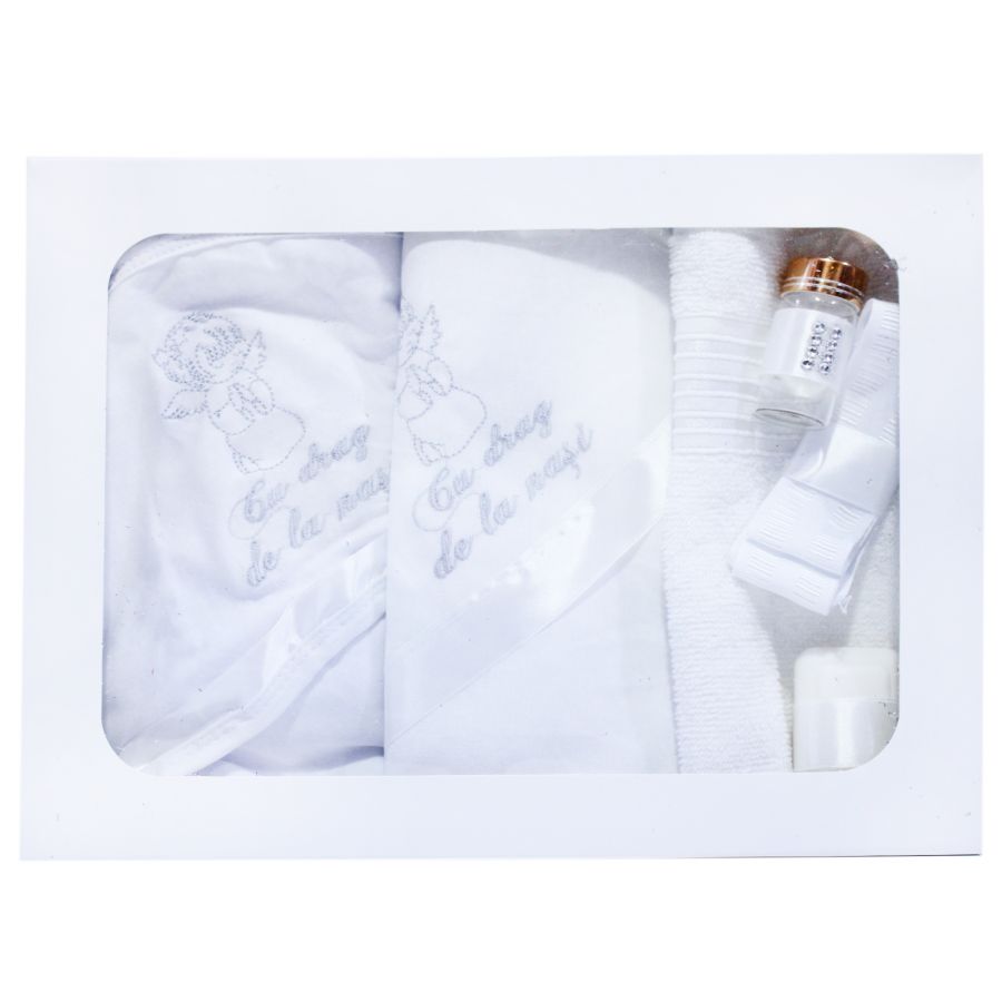Trusou pentru botez, alb-argintiu, cu ingeras brodat, 6 piese, sticla mir, sapun, panza mir, fasa, prosop cu capison, prosop preot, REC279